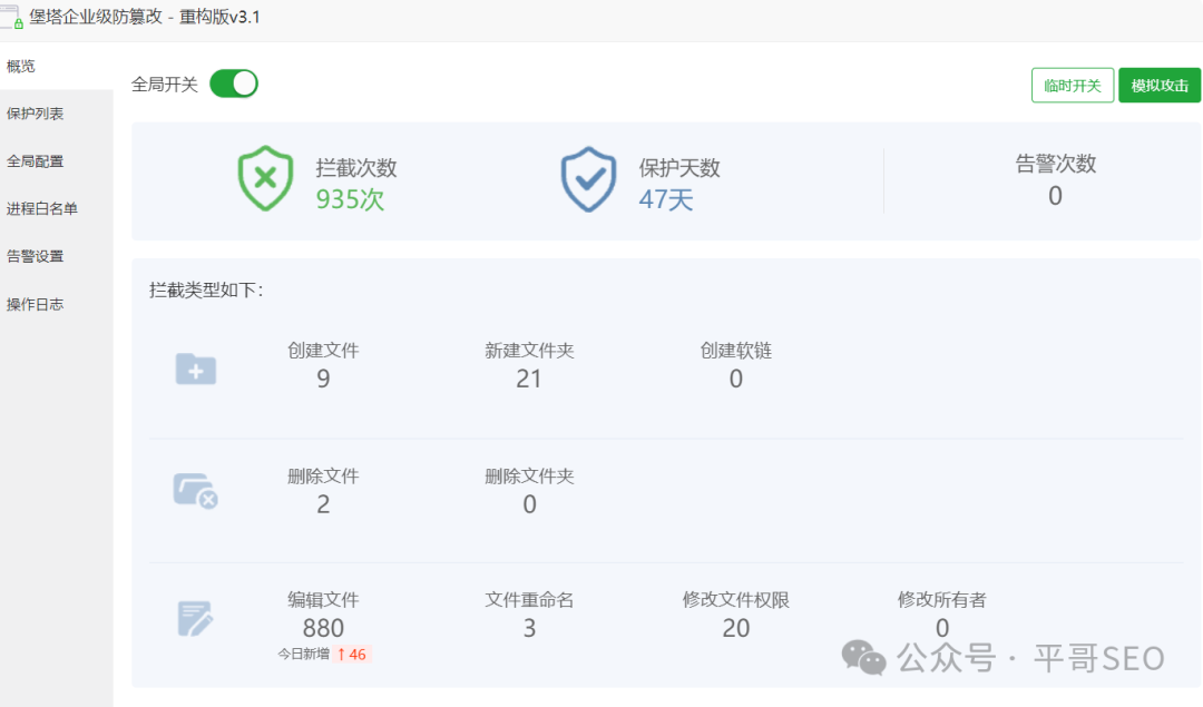 (3)如果您的网站是服务器,可以增加一个宝塔防篡改的软件,每次更新网站内容可以先关闭,等更新完了再打开,可以有效的防止别人植入和上传一些木马文件进去。