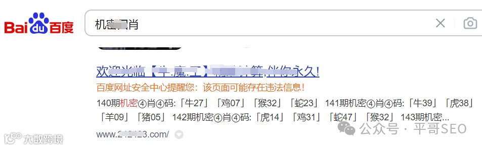 通过site语法搜索站点域名,结合一些常见的色情、菠菜类词汇,搜索结果中展现不属于网站的非法页面、非法违规标题和摘要等。