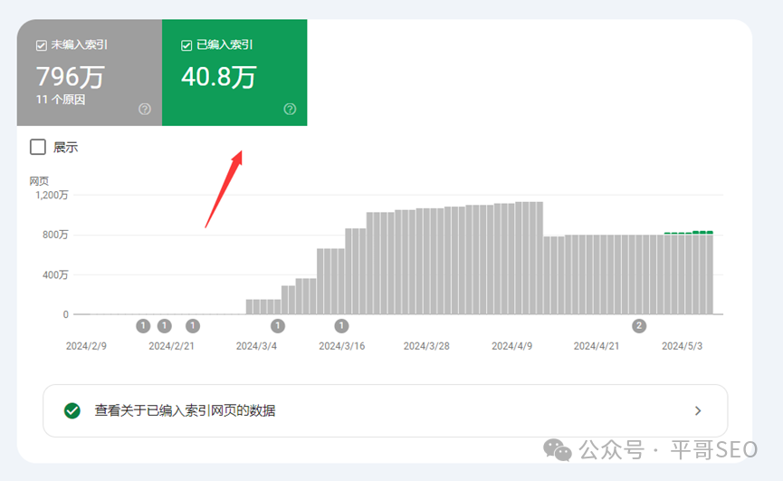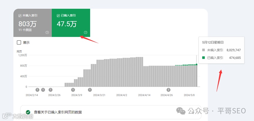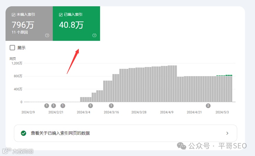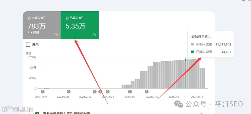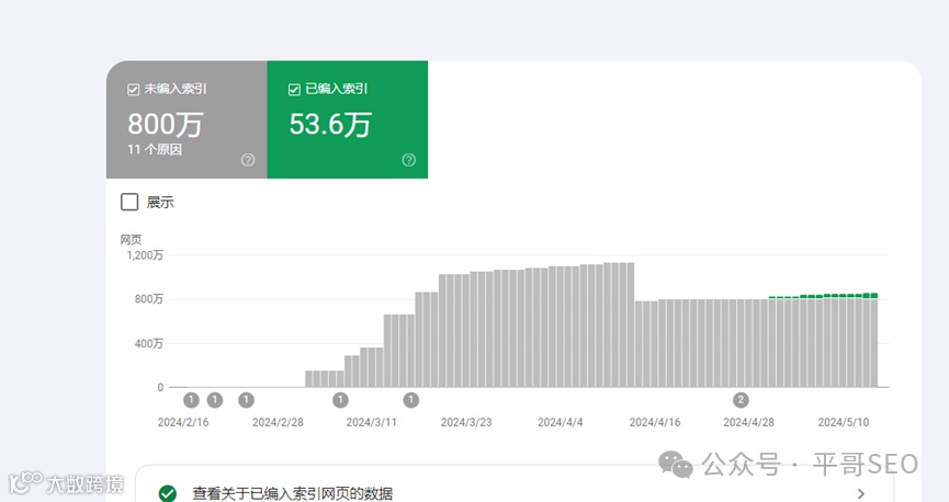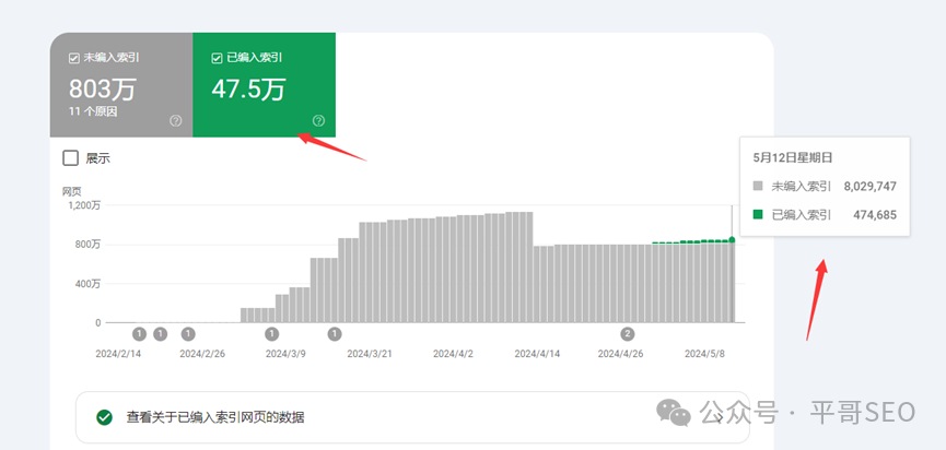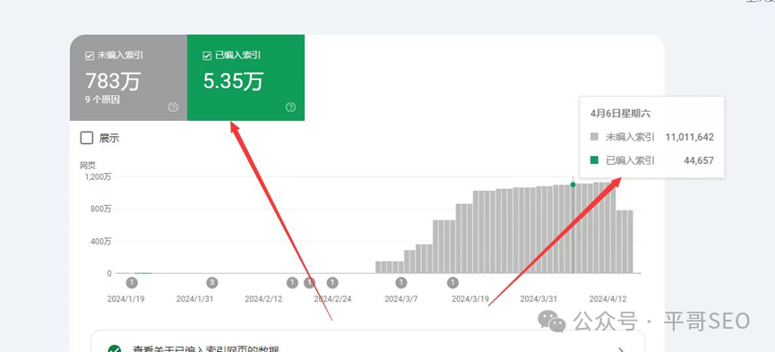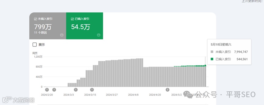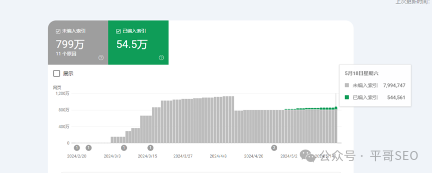 2、索引量收录的变化,从收录5w到收录将近55w左右,直接看效果图: