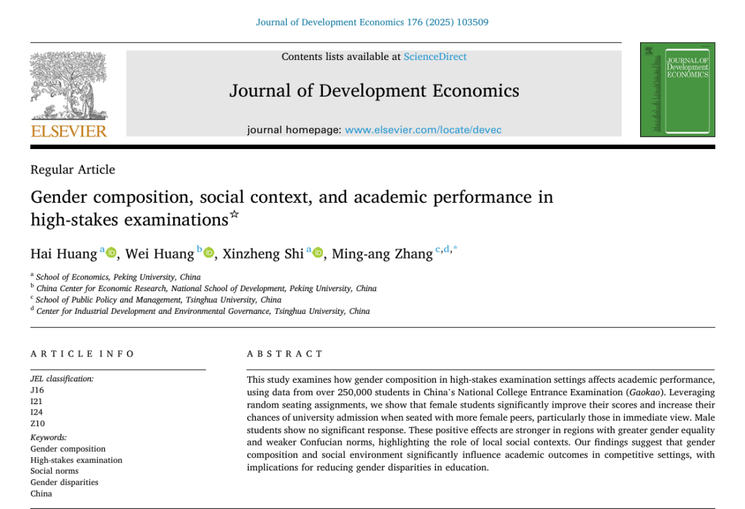 北大博士生黄海以第一作者发表顶刊Journal of Development Economics,研究名为“Gender composition, social context, and academic performance in high-stakes examinations”,合作者包括北京大学国家发展研究院中国经济研究中心黄炜教授、北京大学经济学教授石新正和中央财经大学副教授张明昂。研究打破了传统性别教育研究中对单一性别优势或静态群体结构的孤立分析,首次系统性揭示了班级性别构成与社会环境(如文化规范、教师期望、同伴互动)之间的动态交互机制,证明性别对学业表现的影响并非由生物属性决定,而是通过社会情境中的群体互动模式被建构和强化,为理解教育成果的性别差异提供了 “结构 - 环境 - 行为” 的整合分析框架,丰富了发展经济学中关于教育资源配置与人力资本积累的理论内涵。