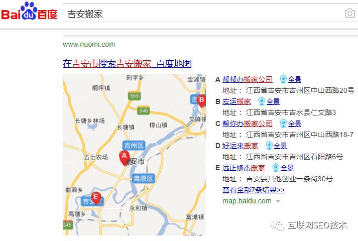 用户需求:出现“百度地图”说明用户有寻找联系方式的需求。例如,从图中可以看出搜索“吉安搬家”这个关键词的用户大部分都在寻找搬家公司,而所需的最基本的信息就是公司地址和联系电话。