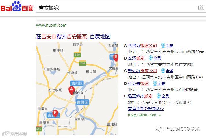 网站的顶部,要清晰地显示出自己公司的地址和联系方式。(目前很多公司都做的不错。)源代码中,描述元素里面要包含联系方式。在网站中展示自己公司的地址,有代码基础的,可以调用“百度地图”官网的API来显示。这里就不举例说明了,因为只要你的网站里提供了网站地图、联系方式,再加上其他体验不会太差,基本都能轻松超越“百度地图”。你可以随便搜索一下本地的服务,例如“广州评估”、“吉安婚庆”等,都可以看到企业站超越“百度地图”的案例。