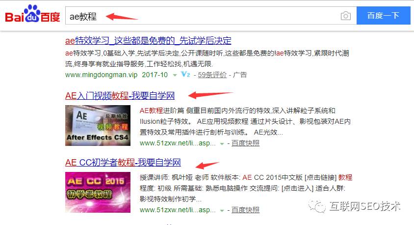 我找了一个案例,大家可以搜索“ae教程”,该关键词百度指数为1000左右。发现“我要自学网是排在“百度视频”前面的就连第三名也有排名。也就是说一个关键词,它占据了两个排名。这是因为“我要自学网”提供了高清视频系列教程,不过打包下载没提供,尽管如此,依旧比其他网站的体验要高出了一大截。