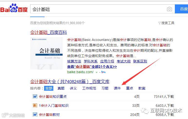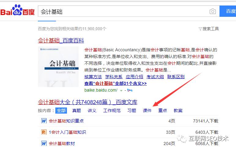 用户需求:出现“百度文库”说明用户有资料需求。 通过图中可以看出搜索“会计基础”这个关键词的用户大部分都在找会计基础知识的重点汇总资料。一般来说,资格考试类、应用文书类、专业资料类行业都会出现百度文库。比如我之前的一个案例:“犀牛之星”;就是把行业的文库资料整理分类,从而提升网站的权重和排名,现在搜索“新三板”关键词都还可以看到排名在首页。
