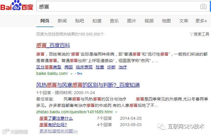 用户需求:出现“百度知道”,说明该关键词有问答需求。通过图中可以看出,使用“感冒”这个关键词的用户是想了解得了感冒的一些相关问题,甚至是希望通过提问的方式获得专家的帮助。一般来说,疾病类的关键词都具备很强的问答需求。
