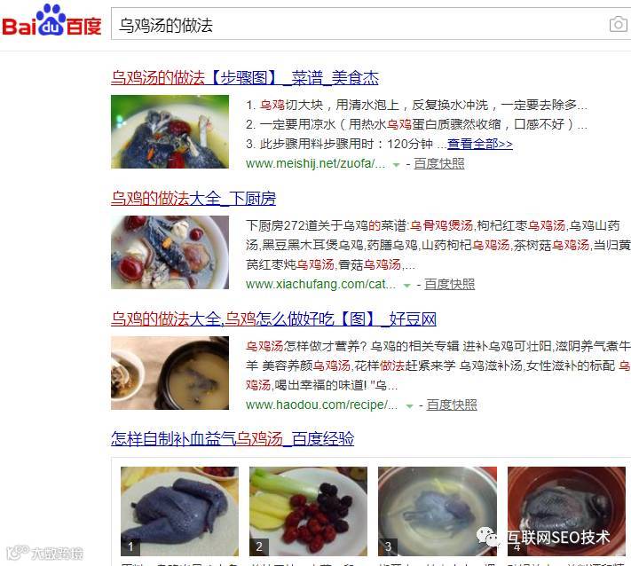 搜索一下“乌鸡汤的做法”,可以看到“下厨房”网站是排在“百度经验”之前的。如果点进去看,就会发现“下厨房”网站提供的乌鸡汤的做法步骤,比“百度经验”提供地更好。“下厨房”网站不但提供了详细的步骤,还用清晰地介绍了用到哪些食材、多少人做过这个,并在最后加上了互动评论模块,用户可以看到其他人的乌鸡汤汤的成功案例。