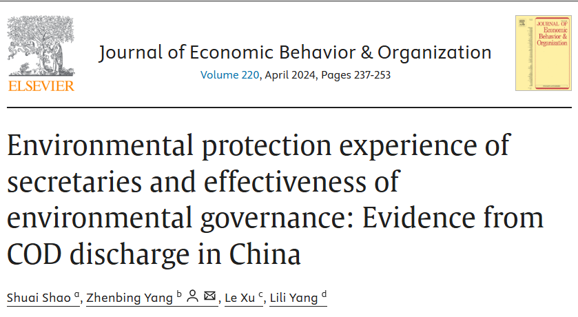 [1]Shao Shuai, Yang Zhenbing, Xu Le and Yang Lili. Environmental protection experience of secretaries and effectiveness of environmental governance: Evidence from COD discharge in China. Journal of Economic Behavior & Organization, 2024, Vol.220: 237-253.