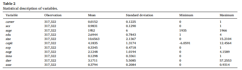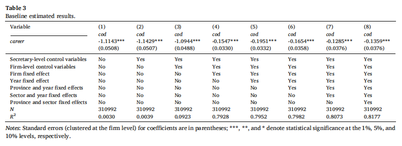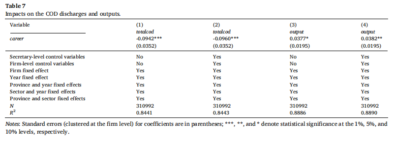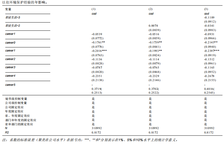 列(3)-(4)系数为正,表明表明企业以前的个人保护经验提高了企业的产出水平。这说明以往的环保经验提高了秘书的环境治理能力,有利于降低了总COD。