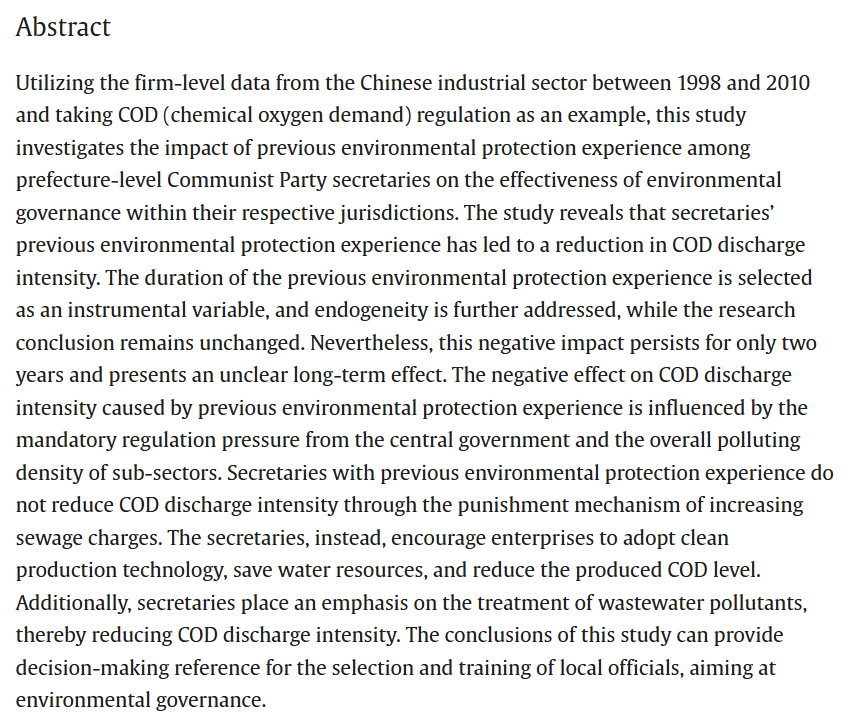 摘要:本研究利用1998 - 2010年中国工业部门的企业层面数据,以COD(化学需氧量)管制为例,考察了地级以上市党委书记的环保工作经历对其辖区内环境治理有效性的影响。研究发现,书记们以往的环保经验导致COD排放强度降低。在研究结论保持不变的情况下,选择以往环保经验的持续时间作为工具变量,进一步探讨了内隐性。尽管如此,这种负面影响只持续了两年,长期影响尚不明确。以往环保经验对COD排放强度的负面影响,受到中央政府强制性调控压力和分行业整体污染密度的影响。以前有环保经验的市委书记,并没有通过增加排污费的惩罚机制来降低COD排放强度。鼓励企业采用清洁生产技术,节约水资源,降低COD的产生量。此外,市委书记重视废水污染物的处理,从而降低COD排放强度。本研究结论可为地方官员的选拔与培训提供决策参考,以达到环境治理的目的。