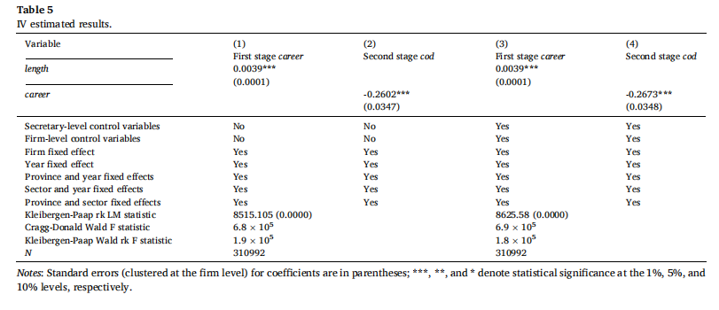 列(1)-(2)显示了2个SLS估计数,没有包含书记级别和公司级别控制变量,而第(3)-(4)列提供了包含所有控制变量和固定效应的估计数。在第一阶段,无论添加控制变量,系数在1%水平上显著为正,表示变量选择的可靠性。第四段证明了它对职业生涯具有强大的解释能力。表5还表明了没有一个弱的IV问题。在第二阶段,照料者的负系数持续存在,这表明,在重新利用后,市委书记以往的环境保护经验降低了企业的COD排放强度。