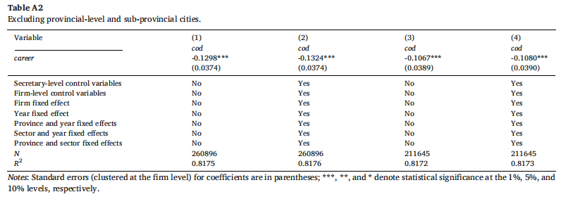 表结果显示:在排除省级城市后,系数依然为正,表明一个城市的行政等级不影响本研究的研究结论。