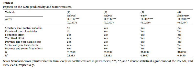 表8 结果显示:官员以往的环保经验鼓励企业在生产过程中节约热水和淡水资源的投入规模。这导致工业企业实现了生产要素节约、产量增长和COD减少的清洁生产技术进步