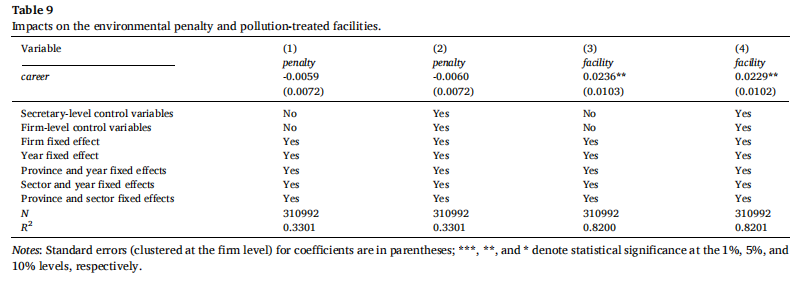 表9 结果显示:系数显著为负,表明任命有以往环境保护经验的官员,大大增加了企业的废水处理和餐饮设施的规模。这表明,以往的环境保护经验提高了秘书的环境治理能力,降低了编码收费的强度和规模,不是通过严格的惩罚措施,而是通过激励企业提高其污染处理能力。