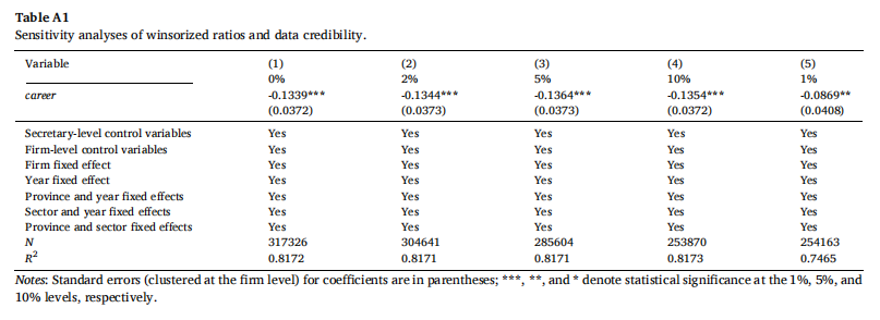 表4结果显示:在秘书上任前的任何一年里,以往的环保经验对其管辖范围内企业的COD排放强度的影响都不明显。显然,只有具有以往环保经验的临时秘书就职,才会对企业的COD排放产生影响。即使添加了所有控制变量,上述估计结果仍然有效,证明了本研究结论的可靠性。