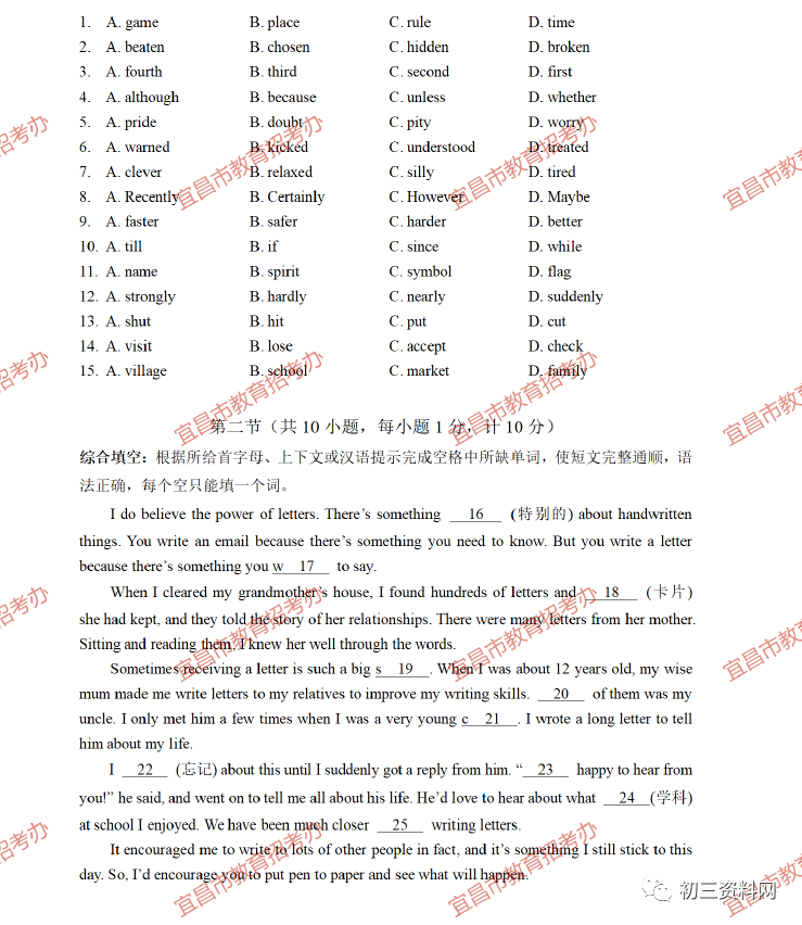 语法填空和单词选择等语法部分,我努力掌握常用的语法规则和词汇,以便能够正确填写适当的单词或短语,使句子结构合理且语法正确。在写作部分,我尝试使用多样的句型和丰富的词汇,以清晰准确地表达我的思想,展现自己在英语表达方面的能力。