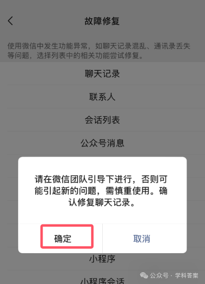 在修复工具界面,找到“故障修复”选项,然后点击“聊天记录恢复”。这个时候,微信会提示你一些注意事项,比如恢复过程中的风险和注意点。