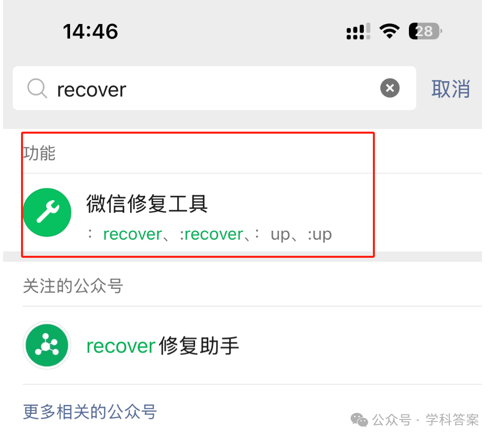 在搜索框里输入“recover”,然后点击搜索。注意,这个词是英文的“recover”,别输错了哦!如果你打成“recovery”或者“recove”,那就尴尬了,微信可不认。