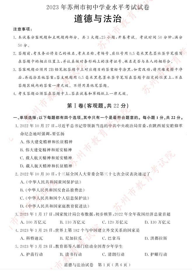 中考真题-2023江苏苏州中考政治真题及答案快收藏!