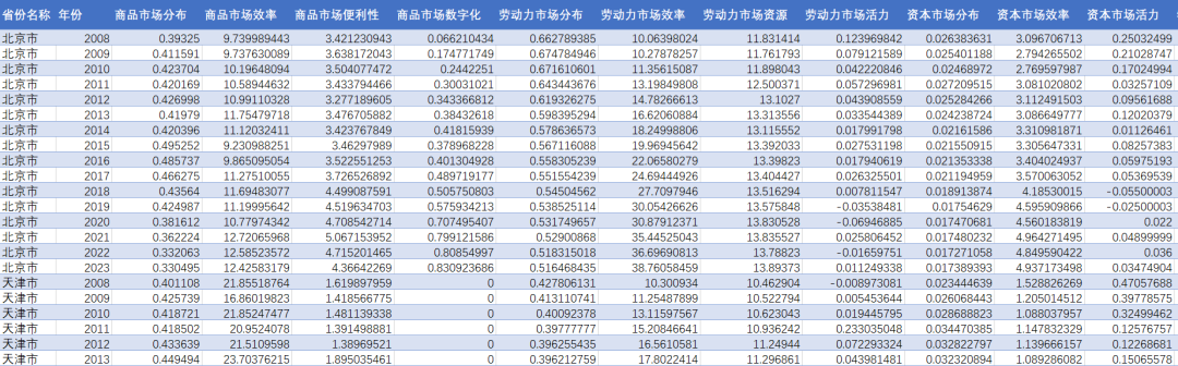 参考章印(2025)的做法,本文将全国统一大市场内涵拓展为由市场发展质量、市场一体化和市场发展环境三个维度组成的综合系统。三者互促互进,合力推进全国统一大市场的发展广度和深度延伸。基于上述对全国统一大市场发展内涵的剖析,遵循科学性、可操作性等原则,构建了包含3个维度、9个因素、32项具体指标的全国统一大市场发展水平评价指标体系,并运用熵值法测度全国统一大市场发展水平。需要说明的是,指标体系中的商品、劳动力和资本市场分割指数参考赵奇伟和熊性美(2009)的研究计算而得,第一、二、三产业的区位熵参考白重恩等(2004)的研究计算而得。个别省份某年份的缺失数据以其上一年的变化率推算或线性插值法插入补齐。