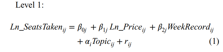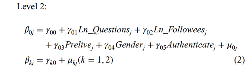 在零模型的基础上,我们在第一级(即实时)引入了第一级自变量,以估计组内方差和卖方级因素的影响。第二级自变量被添加到第二级(即知识提供者),以估计组间方差和生活水平因素的影响。模型1至4描述了现场讲座广播前的场景(第一阶段)。模型1如下面的方程式(1)和(2)所示,与模型1相比,模型2增加了知识提供者的内部声誉;模型3增加了知识提供者的外部声誉;模型4增加了知识提供者的内部和外部声誉。