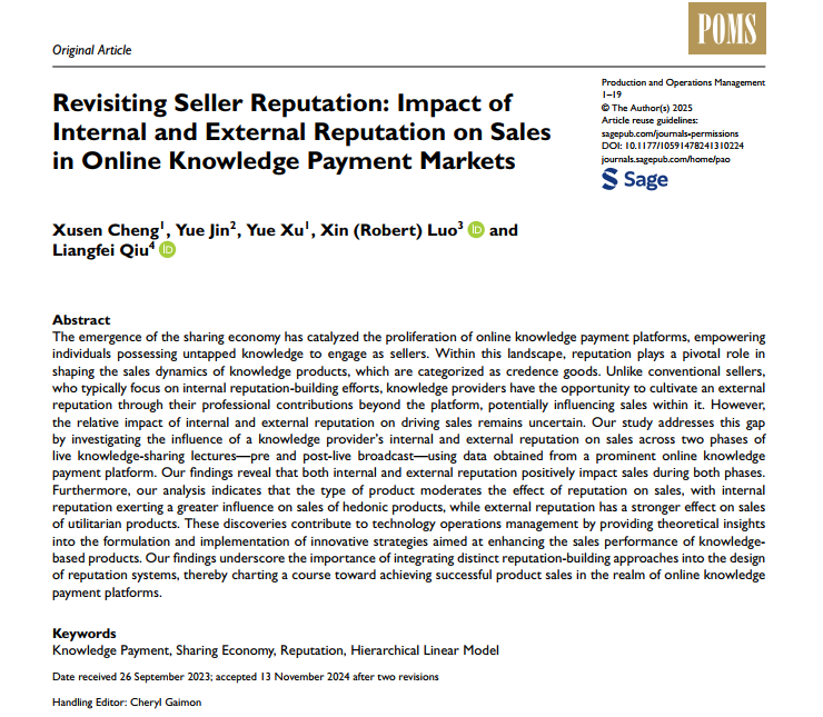 近日,中国人民大学信息学院经济信息管理系程絮森教授和其指导的硕士生许玥,以及对外经济贸易大学副教授金悦、美国新墨西哥大学教授Xin(Robert) Luo、美国佛罗里达大学教授Liangfei Qiu,共同在国际管理学顶级期刊Production and Operations Management(UTD24/FT50期刊)上发表《Revisiting Seller Reputation: Impact of Internal and External Reputation on Sales in Online Knowledge Payment Markets》一文。POM是金融时报评定出的50本商学院顶级期刊之一(Financial Times 50 Journals,简称FT50)。此论文是首次以中国人民大学信息学院作为第一作者单位在POM上发表的研究成果,对于提升该院管理科学与工程学科的国际学术影响力具有重要作用。