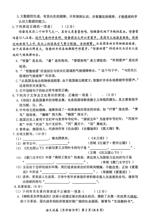 中考真题-2023黑龙江齐齐哈尔语文真题及答案快收藏!