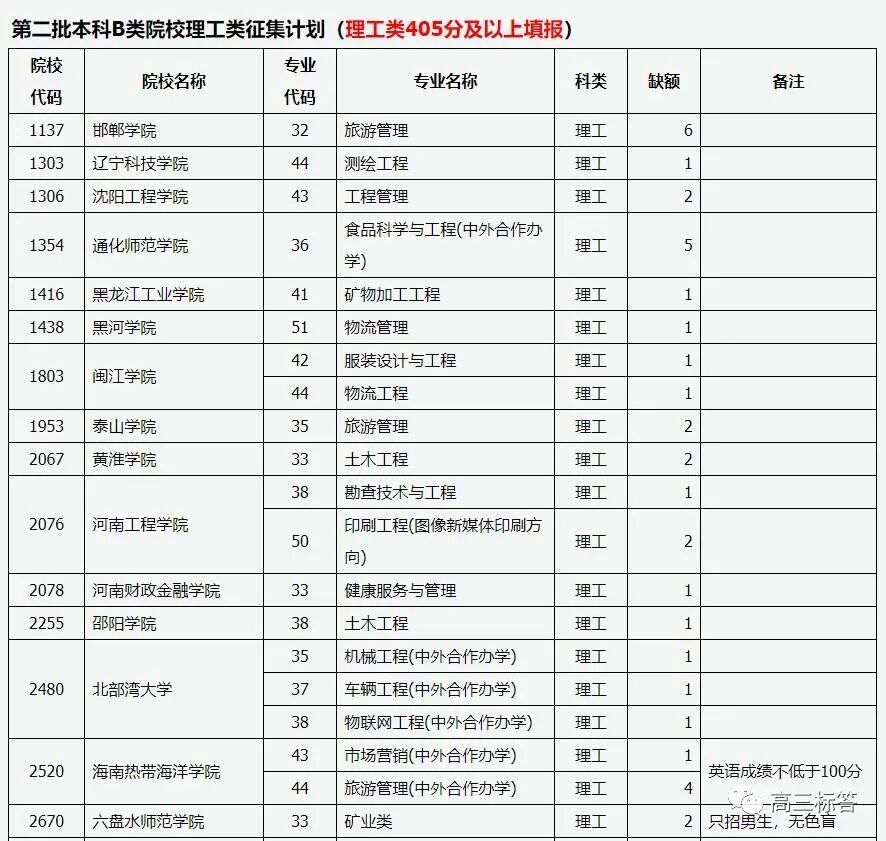 理科没招满的二本大学有30所,包括:邯郸学院、辽宁科技学院、黑河学院、泰山学院、邵阳学院、山西能源学院等,具体缺额人数预专业如下: