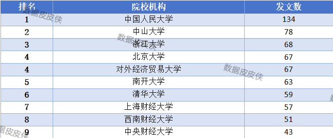 o中国人民大学(134篇)以绝对优势领跑,远超第二名中山大学(78篇),体现其在管理学科和政策研究的长期积累。