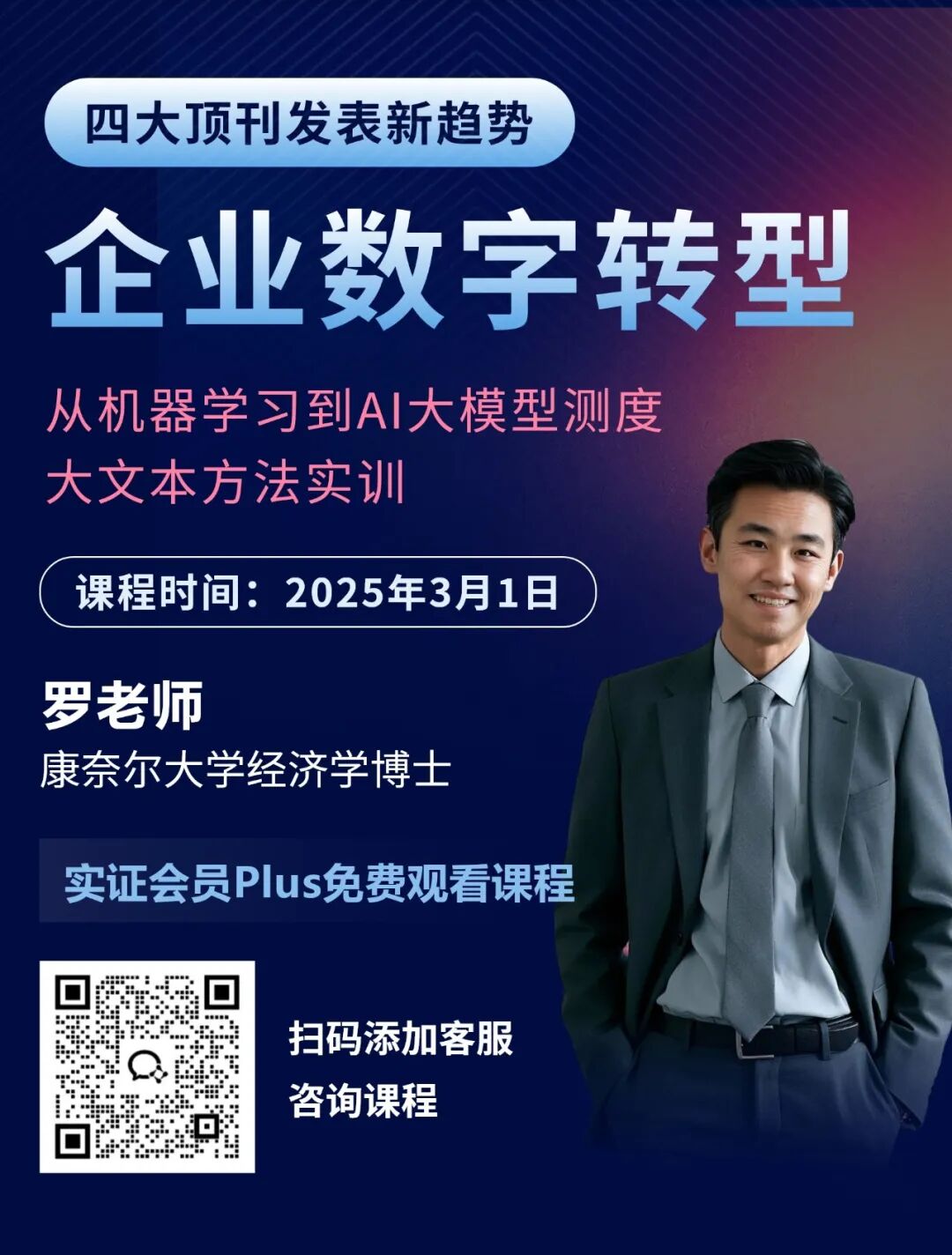 课程名称:四大顶刊发表新趋势:企业数字转型,从机器学习到AI大模型测度大文本方法实训