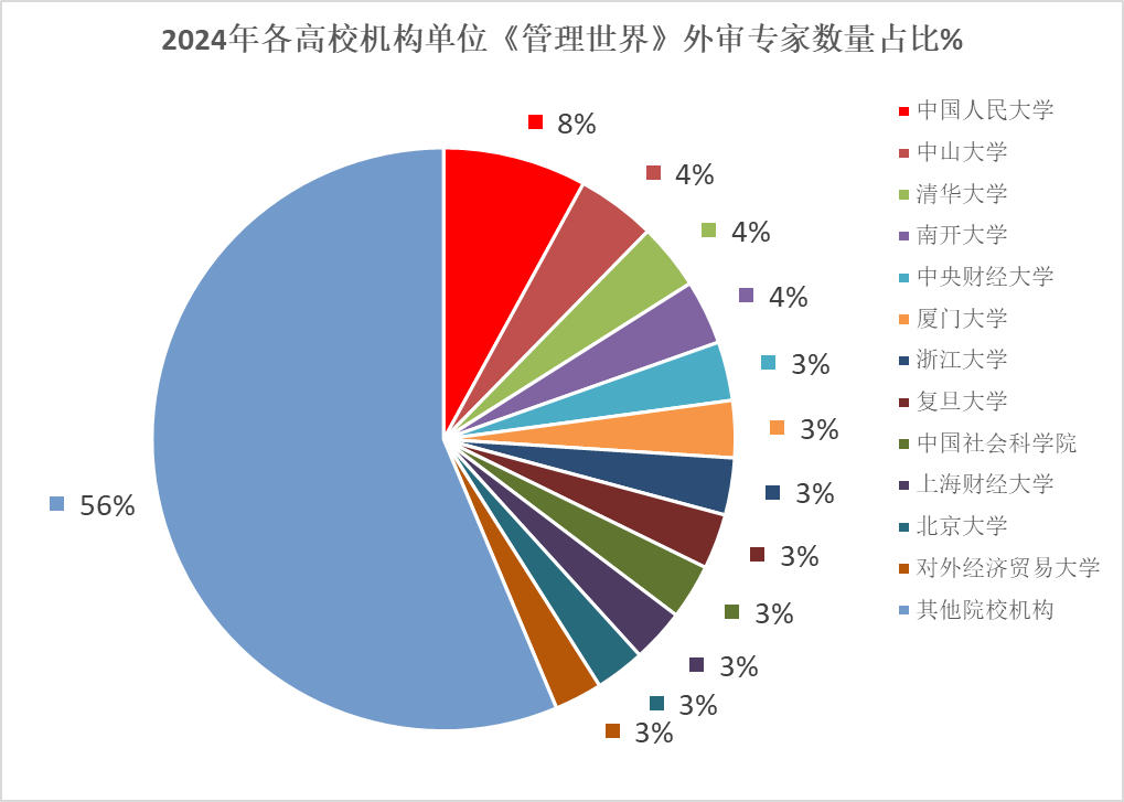 另一方面,我们特意制作了一张饼图,直观地呈现2024年《管理世界》外审专家的来源分布。总体来看,共有来自144所院校和机构的工作人员入选该刊外审团队。其中,排名前十的院校和机构合计占据了近44%的总人数,充分体现了这些顶尖单位在管理学领域的核心影响力和专家资源的高度集中。