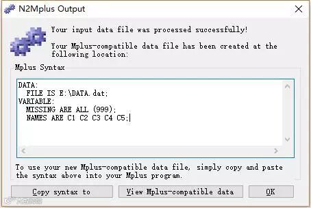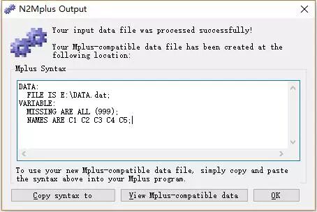 (5)点击“Go!”进行数据转换(转换后的数据自动保存在原始数据的存放位置),并自动生成Mplus中关于DATA和VARIABLE部分的syntax,如图5所示。最后,只需复制syntax到Mplus中即可顺便完成DATA和VARIABLE的coding。
