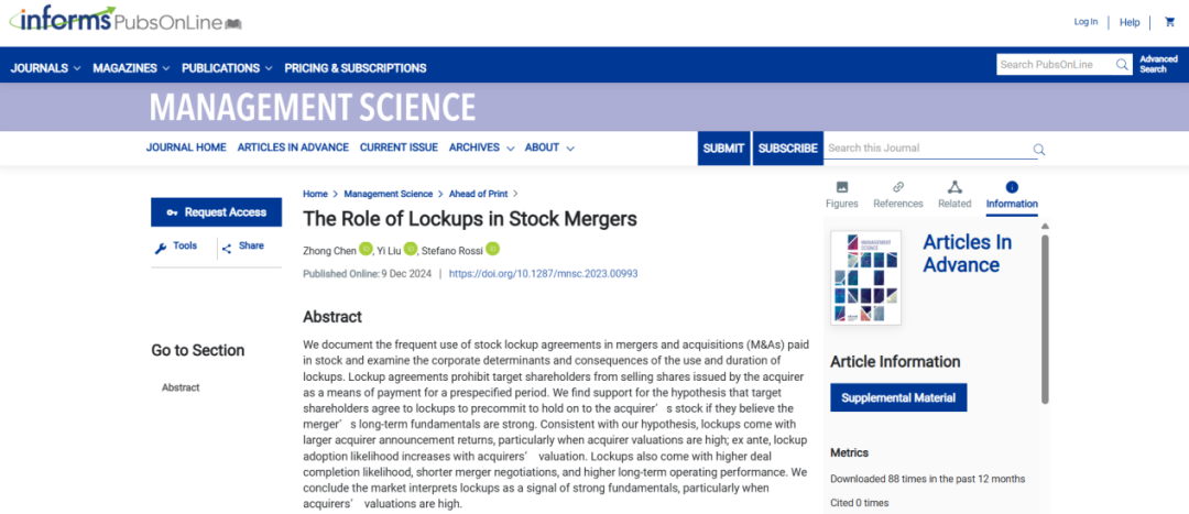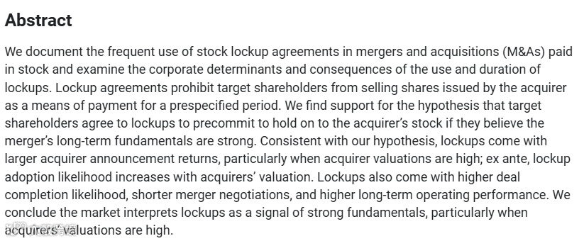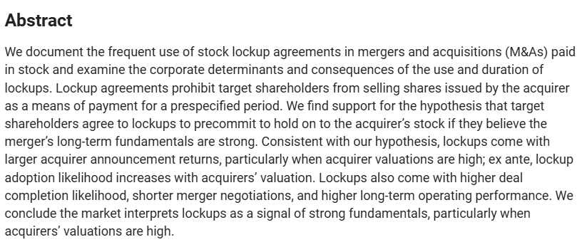 我们记录了在以股票支付的并购(M&A)中股票锁定协议的频繁使用,并检验了使用锁定协议及其期限的企业决定因素和后果。锁定协议禁止目标公司的股东在预先指定的时期内出售作为支付手段发行的收购方股票。我们发现支持这一假设的证据:如果目标公司的股东相信合并的长期基本面强劲,他们同意锁定协议以预先承诺持有收购方的股票。与我们的假设一致,锁定协议伴随着更大的收购方公告回报,特别是当收购方的估值高时;事先,锁定协议的采用可能性随着收购方的估值增加而增加。锁定协议还伴随着更高的交易完成可能性、更短的合并谈判时间以及更高的长期运营表现。我们得出结论,市场将锁定协议解释为基本面强劲的信号,特别是当收购方的估值高时。