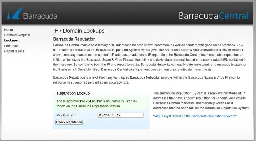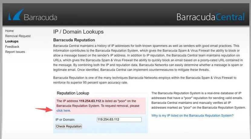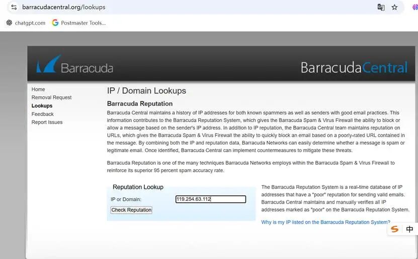 1,登录网址https://www.barracudacentral.org/lookups,输入您的IP,点击“check reputation”