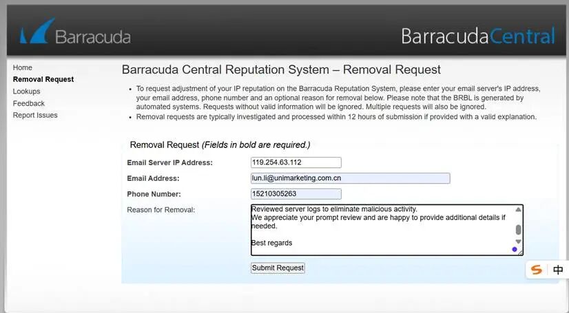 如果邮件群发时,发现退信显示IP被barracudacentral列入黑名单,可以登录其官网申请移除,步骤如下: