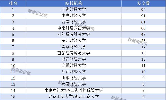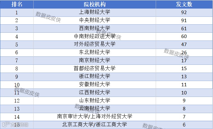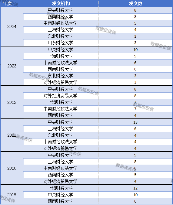 此外,像西南财经大学、中南财经政法大学和对外经济贸易大学这样的全国范围内知名学府,在学术产出方面同样表现突出,发文数量均超过40篇,体现了它们在经济学研究中的学术优势与大力投入。