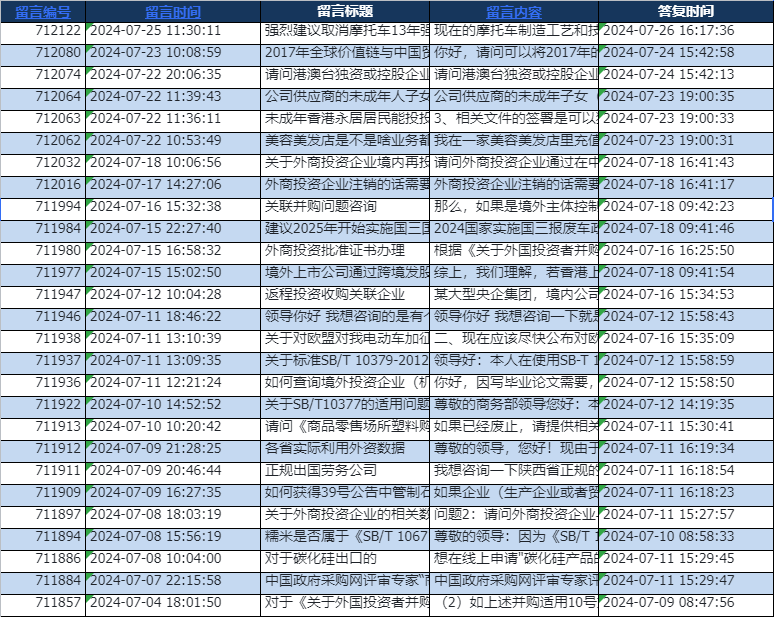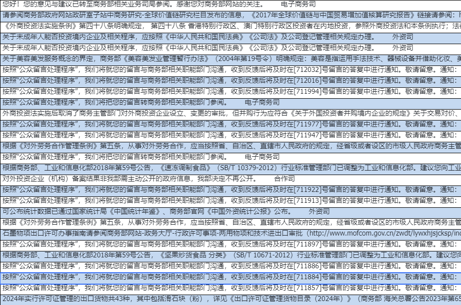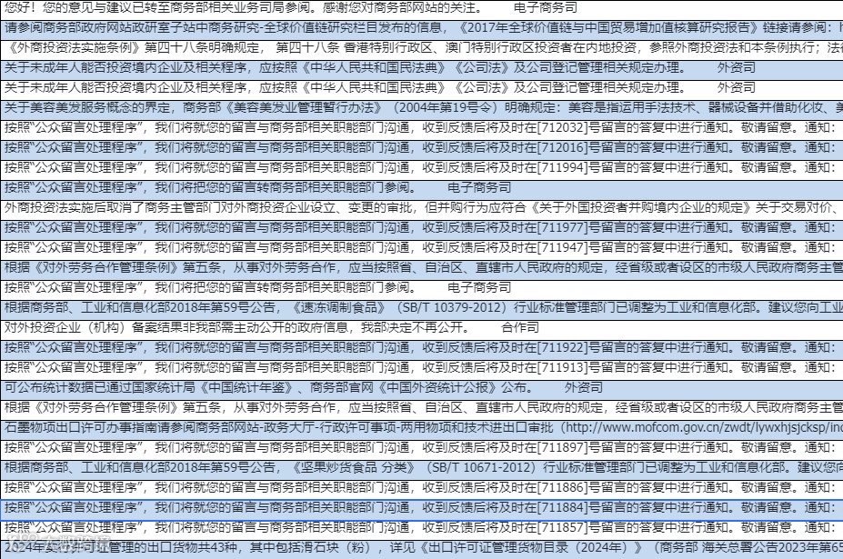 本数据根据中华人民共和国商务部网站相关话题留言及商务部答复进行取录。本数据由数据皮皮侠团队整理。