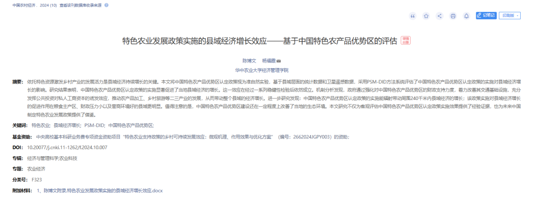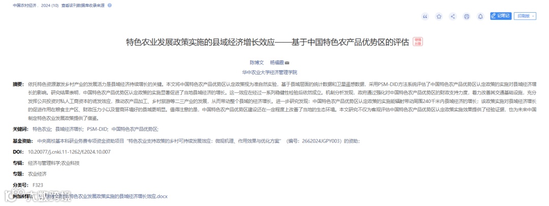 标题:特色农业发展政策实施的县域经济增长效应——基于中国特色农产品优势区的评估