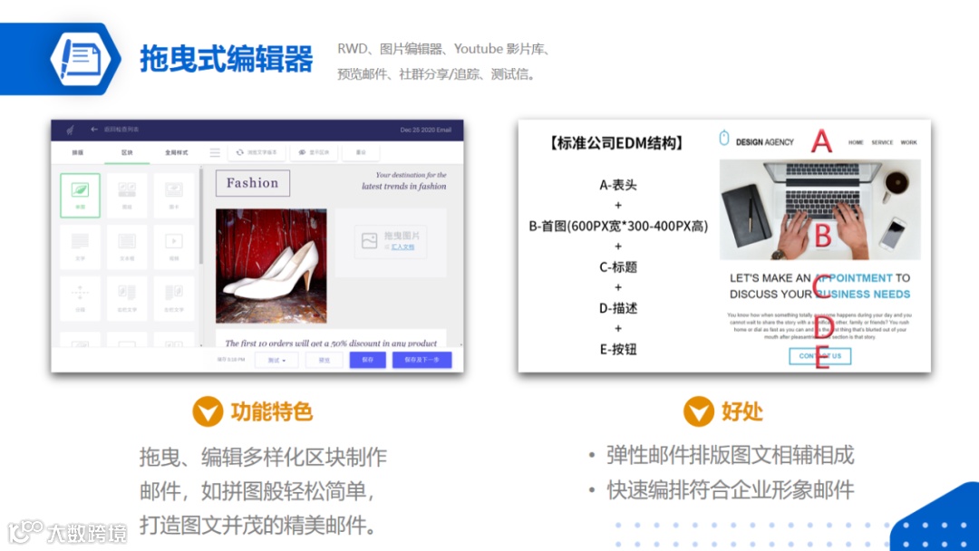 提供邮件群发、邮件推广、邮件代发服务,强调免设计背景,15分钟即能完成一封高质量精美邮件,稳定系统能在短时间内发送100万封的edm邮件。