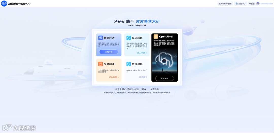 InfinitePaper AI是数据皮皮侠和无限集数科技有限公司联手打造的针对科研人员的AI工具,完美接入官方正版GPT-4o和o1系列模型。已经稳定运行一年时间,原汁原味、毫无虚假的真GPT-4o和o1。