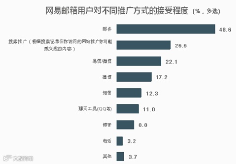 我们一块来看下2014年网易做的一份邮箱用户行为报告。该报告显示,同样的推广内容,网易邮箱用户更愿意接受的推广方式是邮件,接受程度高达48.6%,远远高于搜索推广、微博微信、短信等其他推广方式。