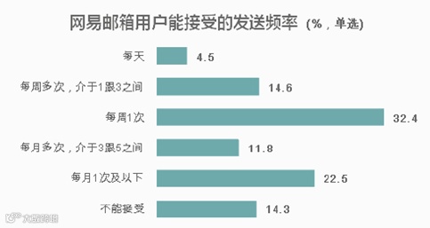 另外,该报告还显示,有85.7%的网易邮箱用户表示能够接受营销邮件,能接受的发送频率主要分布在每周一次(32.4%)和每月一次及以下(22.5%),只有14.3%的网易邮箱用户表示不能接受营销邮件。