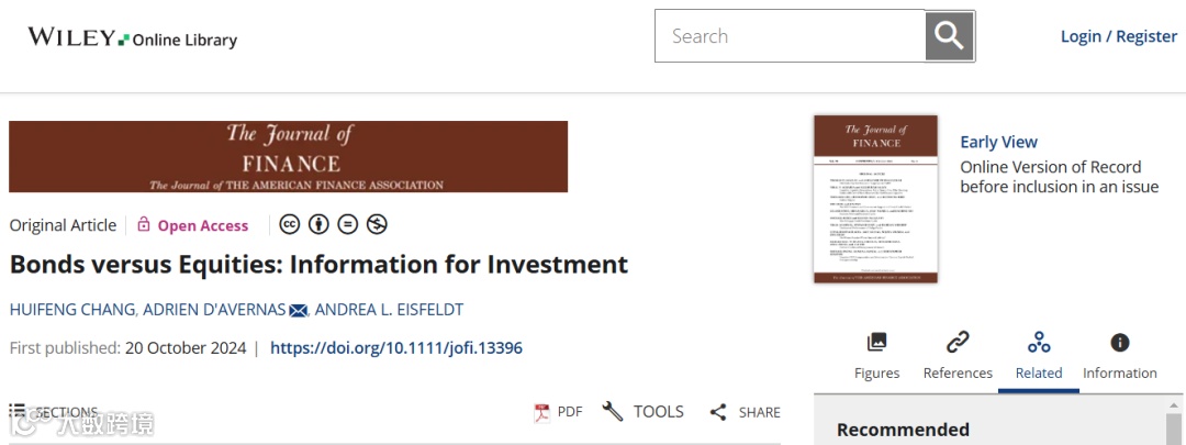 根据JF期刊官网显示,由复旦大学管理学院常惠丰助理教授和斯德哥尔摩经济学院Adrien d'Avernas助理金融教授, 以及加州大学-洛杉矶分校安德森管理学院Andrea Eisfeldt金融学教授合作的论文“Bonds versus Equities: Information for Investment”发表于UTD-24顶级期刊《Journal of Finance》!