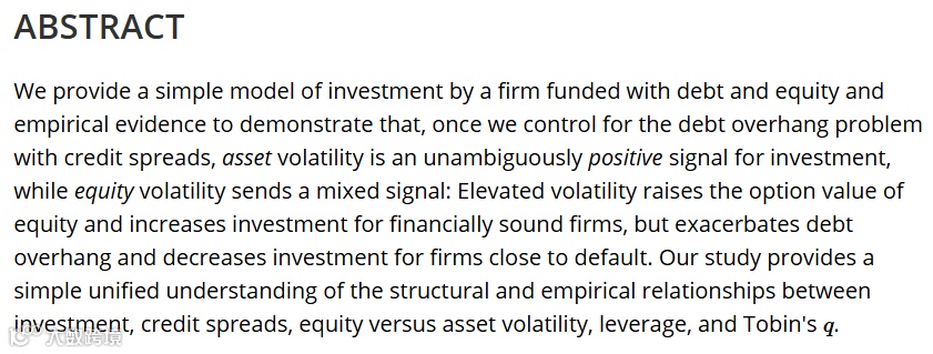 我们提供了一个简单的企业投资模型,该企业通过债务和股权进行融资,并通过实证证据表明,一旦通过信用利差控制了债务超额问题,资产波动率对投资具有明确的积极信号,而股权波动率则传递了复杂的信号:较高的波动性提高了股权的期权价值,对于财务状况良好的公司,波动性增加了投资;但对于接近违约的公司,波动性则加剧了债务超额问题,减少了投资。我们的研究为投资、信用利差、股权和资产波动率、杠杆率及托宾q值之间的结构和实证关系提供了一个简单而统一的理解。