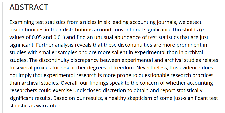 通过对六种主要会计期刊论文中的检验统计量进行研究,我们发现它们在常规显著性临界值(p 值为 0.05 和 0.01)附近的分布存在不连续性,并发现大量检验统计量具有非同寻常的显著性。进一步的分析表明,这些不连续性在样本较小的研究中更为突出,在实验研究中比在档案研究中更为明显。实验研究与档案研究之间的不连续性差异与研究者自由度的几个代理变量有关。尽管如此,这些证据并不意味着实验研究比档案研究更容易出现有问题的研究实践。总体而言,我们的研究结果说明了人们对会计研究人员是否可以行使未公开的自由裁量权来获取和报告具有统计意义的结果的担忧。基于我们的研究结果,我们有理由对一些刚刚具有显著性的测试统计结果持健康的怀疑态度。