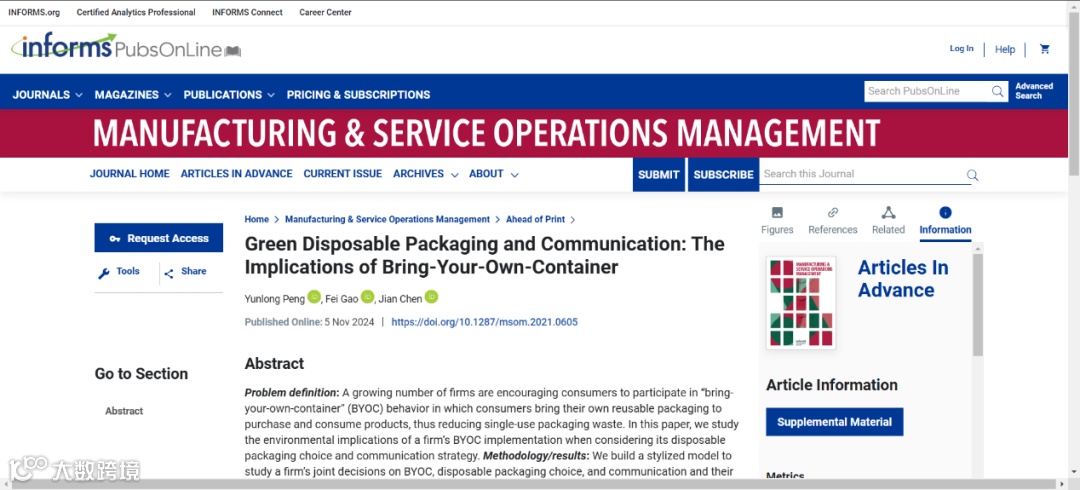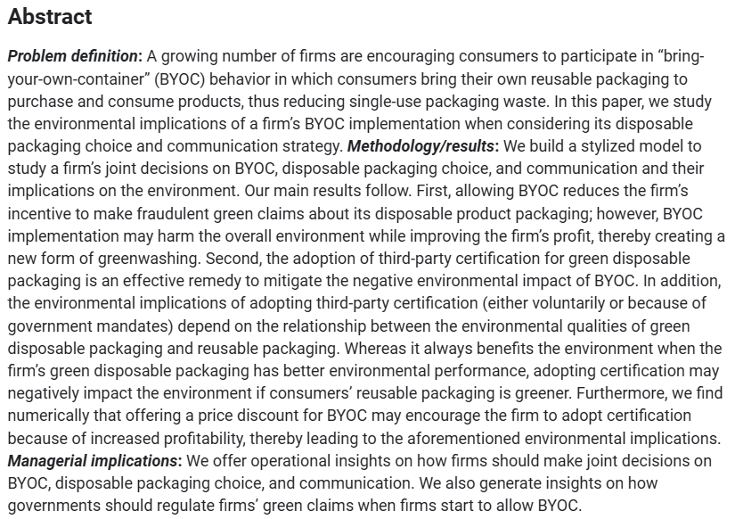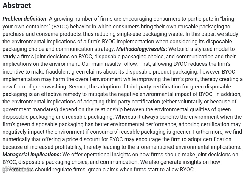 Title:Green Disposable Packaging and Communication: The Implications of Bring-Your-Own-Container