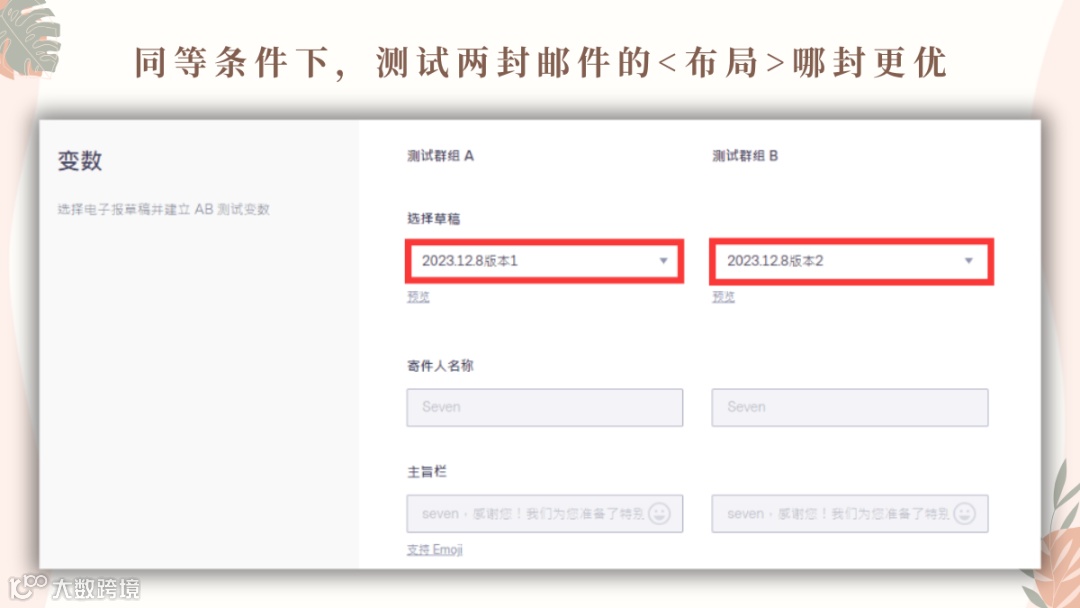 根据测试目标,设计不同的变量,如邮件主题、内容、设计元素、发送时间等。