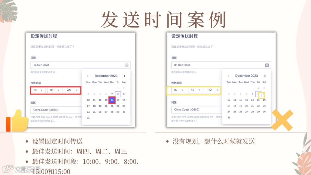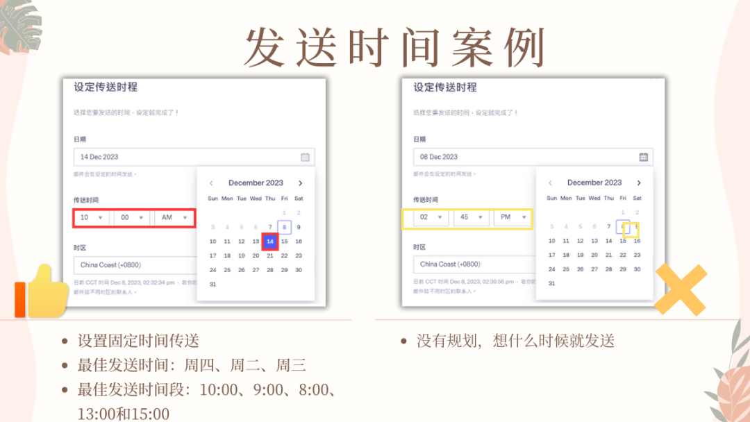 可以通过不同的发送时间和日期来测试,从中得出您的客户群体最经常在哪天的哪个时间段开启或点击邮件,从而提升邮件绩效。