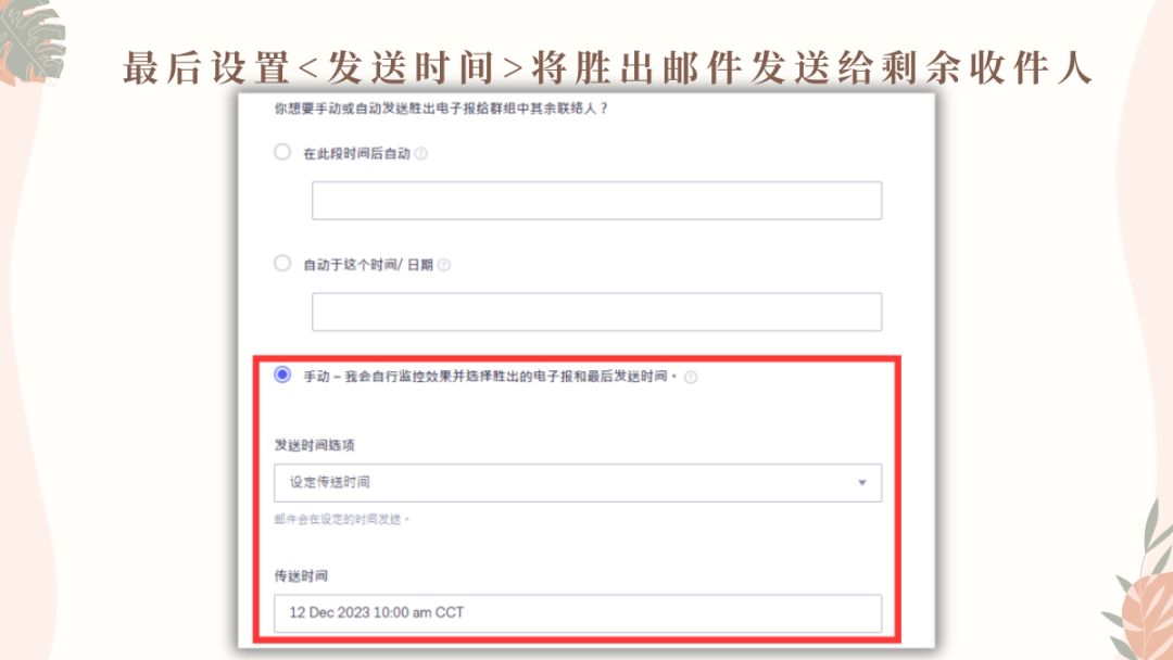 最后设置<发送时间>将胜出邮件发送给剩余收件人