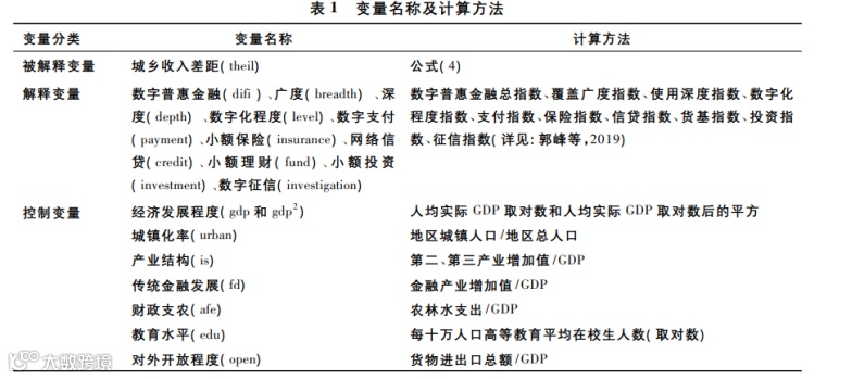 城乡收入比、城镇居民人均可支配收入、农村居民人均可支配收入、泰尔指数、参考程名望(2019)计算泰尔指数,详见前文、数字普惠金融、数字惠普金融指数、覆盖广度、使用深度、数字化程度来自北大数字金融研究中心,详见前文、经济发展、人均实际GDP、取对数及平方(1990年为基期)、城镇化率、地区城镇人口、地区总人口、产业结构、第二、第三产业增加值、GDP、传统金融发展、金融产业增加值、财政支农、农林水支出、教育水平、每十万人口高等教育平均在校生人数的对数、对外开放程度、货物进出口总额