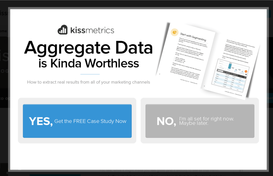 KissMetrics 和 optinmonster 设计的选择性订阅表格,两个同等大小的按钮「YES」和「NO」给用户选择。当然,作为网站的一方当然是希望留住客户,「YES」按钮选择亮眼颜色,另外一个则选用暗色调。
